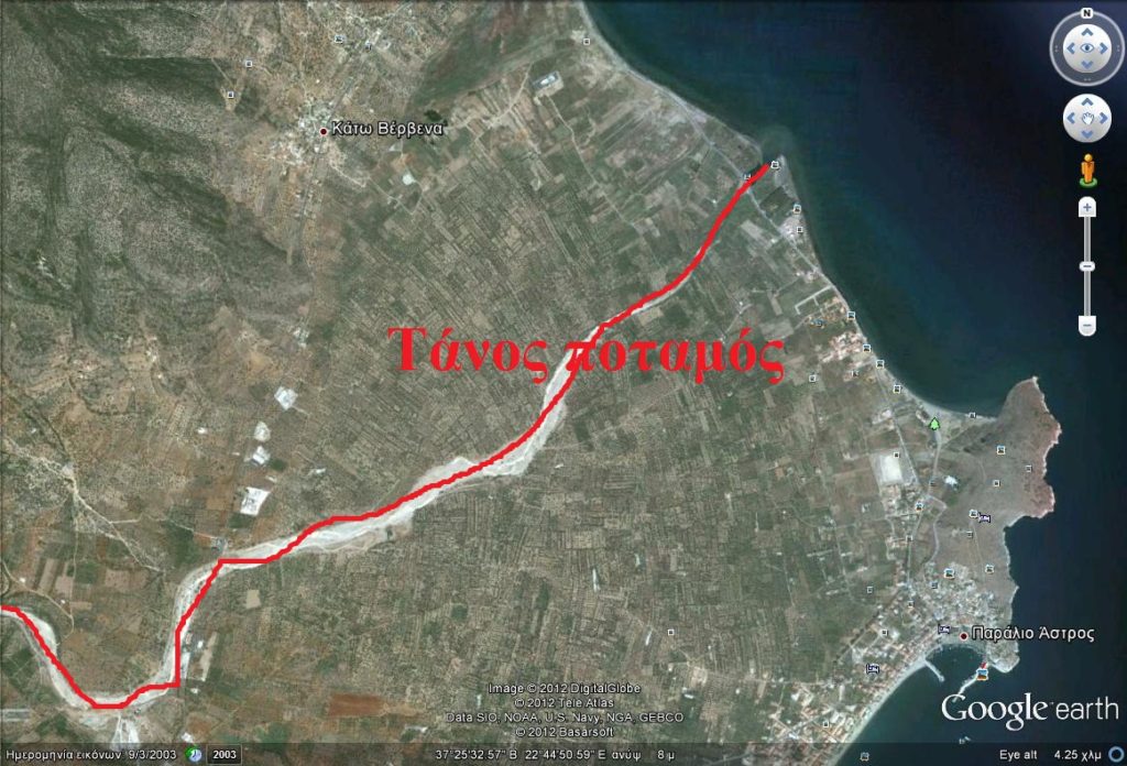 «Γύρω στου Τάναου το ποτάμι, σύνορο που είναι της γης της Σπάρτης και του Άργους», αποσύρθηκε στα γηρατειά του ο τροφός του Αγαμέμνονα σύμφωνα με τον Ευριπίδη, που πρώτος διασώζει το όνομα του ποταμού. Ο ποταμός αυτός ξεκινά από τη Λακωνία, Ν.Α. του αγ. Πέτρου στις πλαγιές του Πάρνωνα (Μαλεβού), συλλέγοντας τα νερά πολλών μικρών πηγών, με μεγαλύτερη αυτήν της Εφτακαρβελούς. Γι’ αυτό και παλιότερα οι γέροι στο Άστρος, όταν πλημμύριζε το ποτάμι λέγανε: «Έρχεται λαμπάδα (κατεβασιά) απ’ την Εφτακαρβελού».