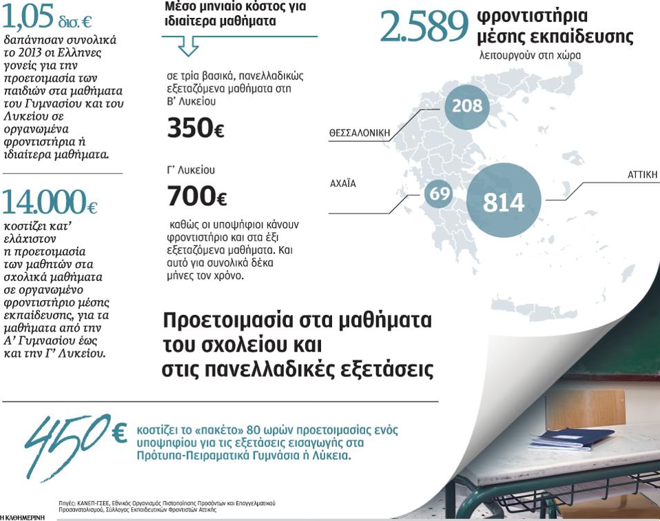 Περίπου 14.000 ευρώ κοστίζει κατ’ ελάχιστον η προετοιμασία των μαθητών για να είναι πανέτοιμοι στην κορυφαία στιγμή της εκπαιδευτικής τους διαδρομής: τις πανελλαδικές εξετάσεις εισαγωγής στα ΑΕΙ. Σύμφωνα με τα στοιχεία του Συλλόγου Εκπαιδευτικών Φροντιστών Αττικής, το ετήσιο κόστος των εκπαιδευτικών προγραμμάτων ξεκινά για τους μαθητές της Α΄ Γυμνασίου από 1.200 ευρώ ετησίως για έξι […]