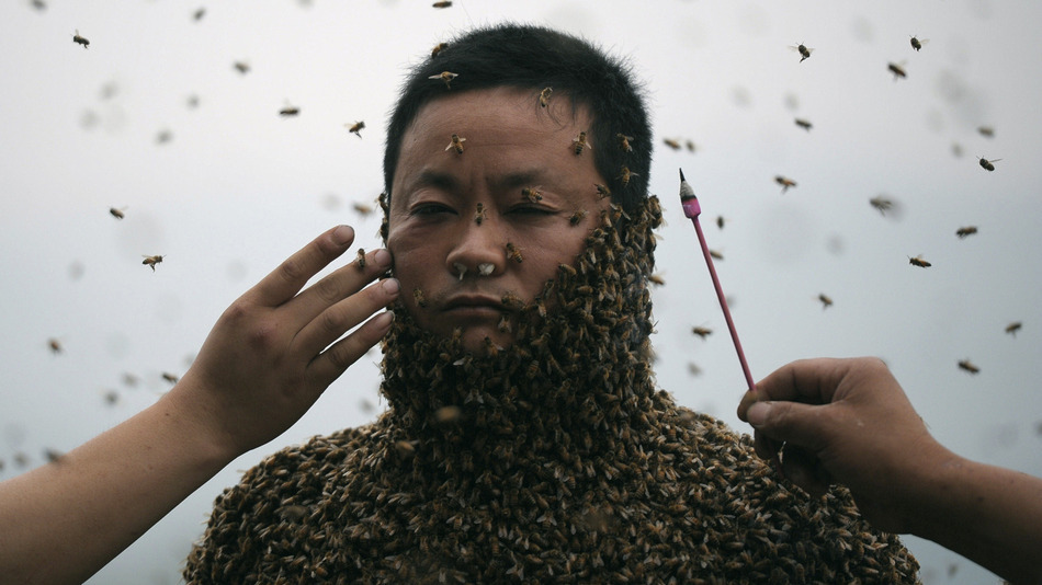 ΣυνέχειαKινέζος παραγωγός καλύφθηκε με μέλισσες βάρους 45 κιλών για να προωθήσει το μέλι του