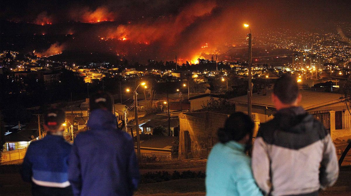 Κάτοικοι του Βαλπαραΐσο της Χιλής παρακολουθούν συντετριμμένοι την πύρινη λαίλαπα να σαρώνει ολόκληρες γειτονιές της πόλης τους. Τουλάχιστον 150 σπίτια και κτίρια καταστράφηκαν ολοσχερώς από τις πυρκαγιές που ξεκίνησαν από τα γειτονικά δάση και ακόμα μαίνοντας εκτός ελέγχου Πηγή: protothema.gr