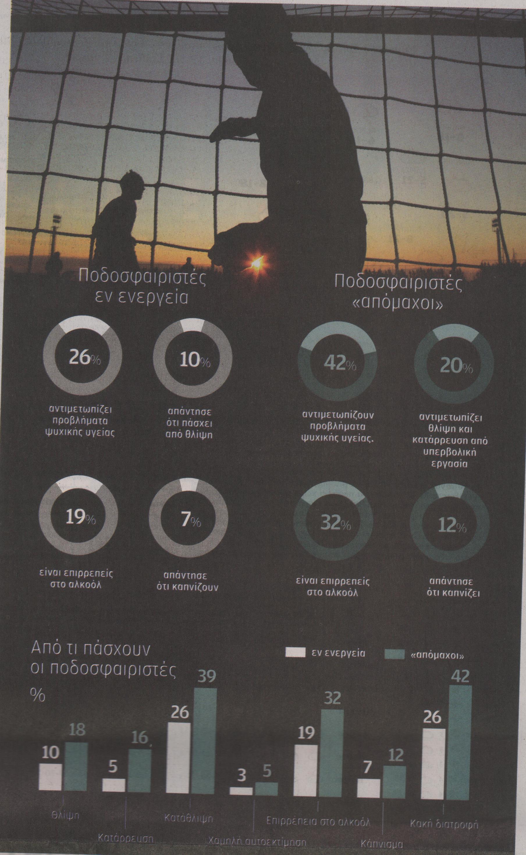 Αν κάποιος υποστήριζε ότι το ποδόσφαιρο βλάπτει σοβαρά την ψυχική υγεία, δύσκολα θα μπορούσε να γίνει πιστευτός. Όμως τα αποτελέσματα της έρευνας που έκανε η FIF-Pro (Παγκόσμια Ένωση Επαγγελματιών Ποδοσφαιριστών) σε συνεργασία με έξι εθνικούς συνδέσμους επαγγελματιών ποδοσφαιριστών από τρεις διαφορετικές ηπείρους, έρχεται να ανατρέψει τις όποιες στερεότυπες αντιλήψεις και να δημιουργήσει νέα δεδομένα.