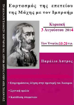 Ο «ΣΥΛΛΟΓΟΣ ΤΩΝ ΑΠΑΝΤΑΧΟΥ ΦΙΛΩΝ ΤΟΥ ΠΑΡΑΛΙΟΥ ΑΣΤΡΟΥΣ ΚΥΝΟΥΡΙΑΣ», σε συνεργασία με το Δήμο Βόρειας Κυνουρίας και το Τοπικό Συμβούλιο Παραλίου Άστρους, σας προσκαλούν στον εορτασμό της επετείου της Μάχης με τον Ιμπραήμ στις 5 και 6 Αυγούστου 1826, που θα πραγματοποιηθεί την Κυριακή 3 Αυγούστου 2014, με επιμνημόσυνη δέηση, ομιλία, κλπ στην προτομή του «Άκουρου» Παναγιώτη Ζαφειρόπουλου, στην πλατεία στο Παράλιο Άστρος, σύμφωνα με το πρόγραμμα, που επισυνάπτεται, εδώ.