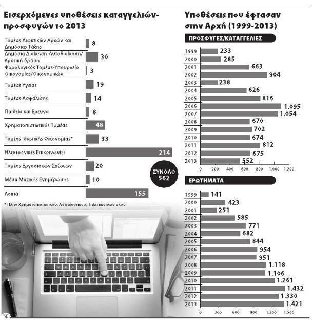 Σύμφωνα με τον ετήσιο απολογισμό της Αρχής, κατά το έτος 2013 το σύνολο των διεκπεραιωμένων υποθέσεων προσφυγών-καταγγελιών, ερωτημάτων κ.ά. ανήλθε σε 2.486, εμφανίζοντας αύξηση μεγαλύτερη του 10% σε σύγκριση με του προηγούμενου έτους. Η Αρχή εξέτασε συνολικά 692 προσφυγές-καταγγελίες και 1.144 ερωτήματα υπευθύνων επεξεργασίας ή πολιτών σχετικά με τη νομιμότητα συγκεκριμένης επεξεργασίας ή τον τρόπο εφαρμογής τής νομοθεσίας.