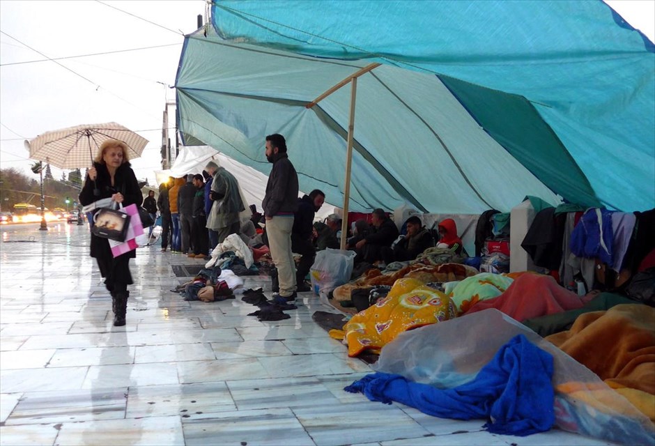Στιγμιότυπο από την πλατεία Συντάγματος, όπου παραμένουν οι Σύροι πρόσφυγες, εκτεθειμένοι στη βροχή και το κρύο. Πηγή: naftemporiki.gr