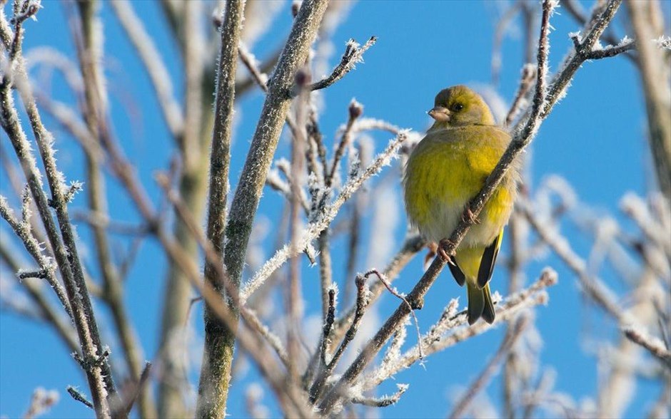 Ένας φλώρος κάθεται στα καλυμμένα με πάγο κλαδιά ενός δέντρου, στο Σιβερσντόρφ, στη Γερμανία. Την έναρξη του χειμώνα, συνοδευόμενη με τα πρώτα χιόνια, υποδέχτηκε η Γερμανία, και σύμφωνα με τη μετεωρολογική υπηρεσία η χιονόπτωση αναμένεται να συνεχιστεί και τις επόμενες ημέρες. Πηγή: naftemporiki.gr