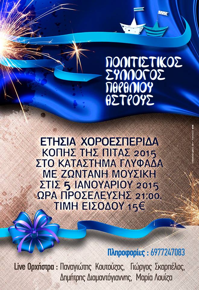"Ο Πολιτιστικός Σύλλογος των Απανταχού Φίλων του Παραλίου Άστρους Κυνουρίας" σας προσκαλεί στη χοροεσπερίδα, που διοργανώνει την Δευτέρα στις 5 Ιανουαρίου, παραμονή των Θεοφανείων, στην ταβέρνα "ΓΛΥΦΑΔΑ", στο Παράλιο Άστρος για το καλωσόρισμα του 2015, με φαγητό, κρασί (περιλαμβάνονται στην τιμή της πρόσκλησης, που είναι 15,00 ευρώ) και χορό με μουσική και τραγούδια από νέους μουσικούς της περιοχής μας.
