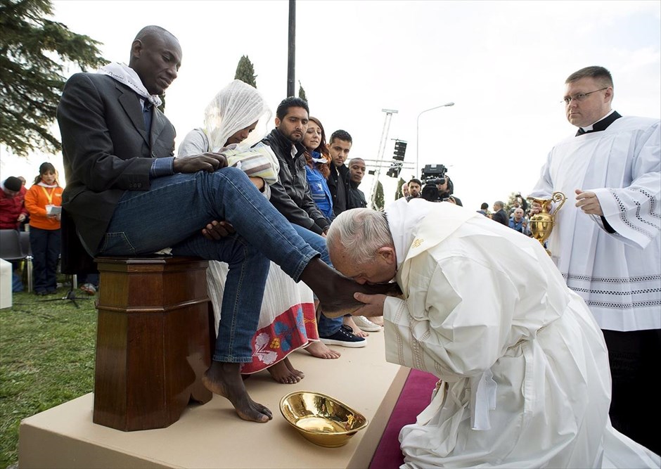 Ο πάπας Φραγκίσκος φιλά τα πόδια ενός μετανάστη, σε ένα κέντρο υποδοχής μεταναστών στο Καστελνουόβο Ντι Πόρτο, στα περίχωρα της Ρώμης. Σπάζοντας για άλλη μία φορά το κατεστημένο της Ρωμαιοκαθολικής εκκλησίας, ο Πάπας τέλεσε τη θεία λειτουργία και έπλυνε τα πόδια προσφύγων, σε κέντρο υποδοχής μεταναστών έξω από τη Ρώμη. Στο κήρυγμα του κατά την ακολουθία του Νιπτήρος αναφέρθηκε στις τρομοκρατικές επιθέσεις των Βρυξελλών.