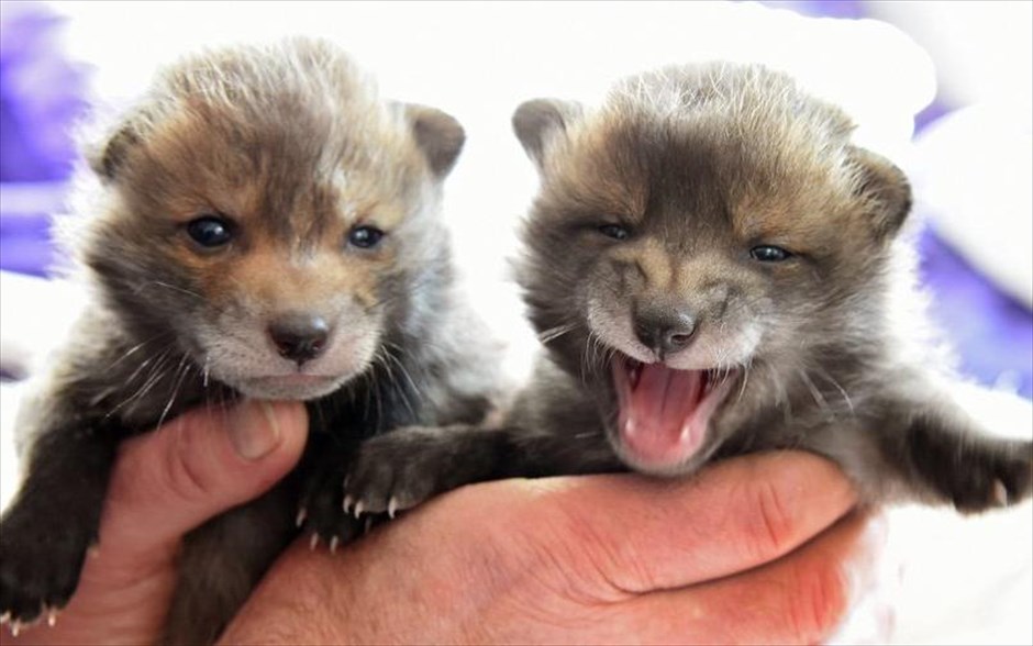 Δύο νεογέννητες αλεπούδες, η Pepper (αριστερά) και η Chilli (δεξιά) παρουσιάζονται για πρώτη φορά δημοσίως σε πάρκο προστασίας της άγριας ζωής στο Αννόβερο της Γερμανίας. Έξι ορφανές μικρές αλεπούδες δόθηκαν για φροντίδα στο πάρκο στα τέλη Μαρτίου.