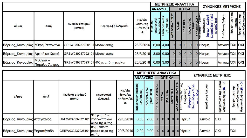 Ημερομηνία δειγματοληψίας 28/29-6-2016. Επιτρεπόμενα όρια: Εντερόκοκκοι = 100 Κολοβακτηρίδια escherichia coli = 250 Πηγή: Αποκεντρωμένη Διοίκηση Πελοποννήσου, Δυτικής Ελλάδας & Ιονίου (Διεύθυνση υδάτων)