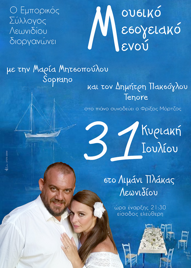 ΔΕΛΤΙΟ ΤΥΠΟΥ Ο Εμπορικός, Βιοτεχνικός και Επαγγελματικός Σύλλογος Λεωνιδίου "Νέα Εποχή" διοργανώνει την Κυριακή 31 Ιουλίου 2016 μουσική βραδιά "Μουσικό Μεσογειακό Μενού" στο Λιμάνι της Πλάκας Λεωνιδίου με την σοπράνο Μαρία Μητσοπούλου και τον τενόρο Δημήτρη Πακσόγλου. Στο πιάνο συνοδεύει ο Φρίξος Μόρτζος. Ώρα έναρξης 21:30 Είσοδος ελεύθερη Σας περιμένουμε όλους