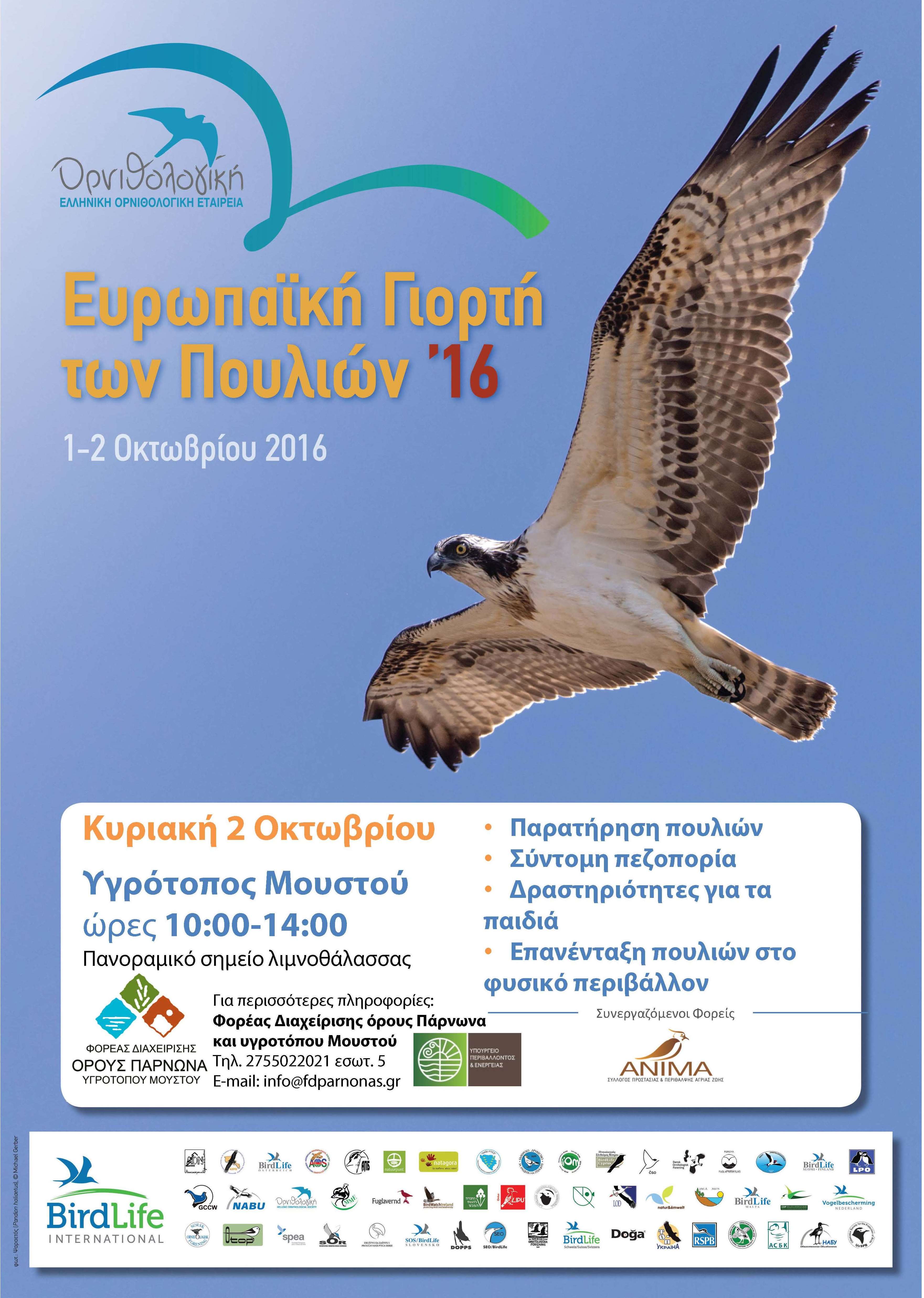 Δελτίο τύπου Η Πανευρωπαϊκή Γιορτή των Πουλιών (EuroΒirdwatch) πραγματοποιείται κάθε χρόνο το πρώτο σαββατοκύριακο του Οκτωβρίου με αφορμή το ταξίδι της μετανάστευσης εκατομμυρίων πουλιών που κατά την φθινοπωρινή περίοδο πετούν προς τις περιοχές διαχείμασής τους, στη Μεσόγειο και την Αφρική. Η Πανευρωπαϊκή Γιορτή των Πουλιών είναι η σημαντικότερη εκδήλωση των εταίρων του BirdLife International, τόσο […]