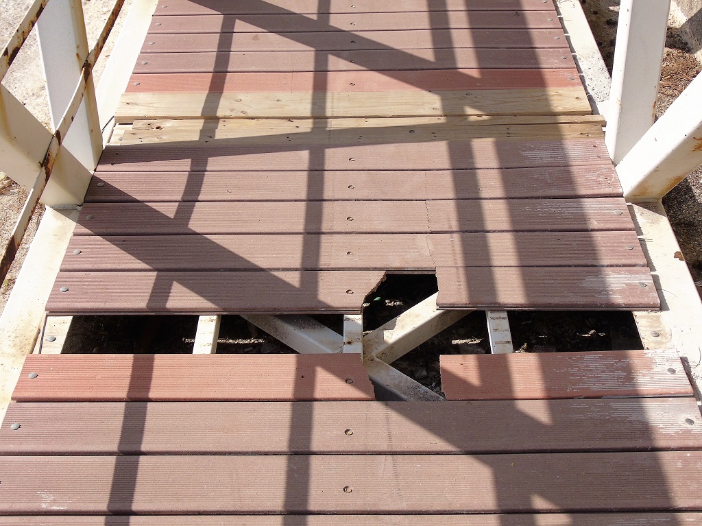 Η πεζογέφυρα που οδηγεί στο Ανοιχτό Θέατρο Παραλίου Άστρους είναι γεμάτη «παγίδες» από σπασμένα κομμάτια, βλέπε το φωτογραφικό υλικό το οποίο είναι τραβηγμένο χτες, Δευτέρα 10-10-2016 στις 13.50. Αν κάνει κάποιος σύγκριση δε με προηγούμενη ανάρτηση μας, στις 19-9-2016 http://astrosparalio.gr/?p=singlearticle&id=30523, θα δει ότι, η κατάσταση έχει χειροτερέψει.