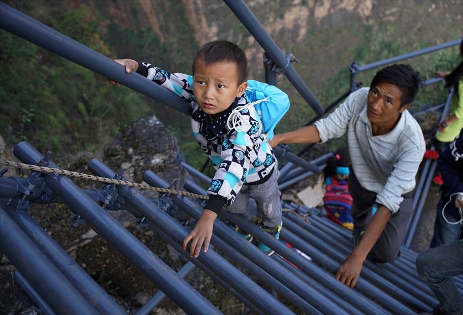 Ένα μικρό αγόρι επιστρέφει από το σχολείο του στο Liangshan της επαρχίας Σετσουάν, στην Κίνα. Οι τοπικές αρχές τοποθέτησαν στο σημείο μια σκάλα που μειώνει σημαντικά τον χρόνο μετακίνησης των μαθητών από το «χωριό των βράχων», όπως είναι γνωστό, λόγω της τοποθεσίας του. Πηγή: naftemporiki.gr