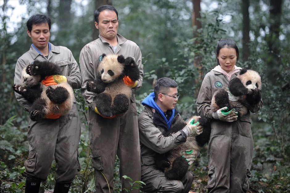 Ερευνητές κρατούν στα χέρια τους 4 μικρά πάντα, στα πλαίσια εορταστικής εκδήλωσης που διοργανώθηκε με αφορμή την έλευση του 2017, σε ερευνητικό κέντρο στο Ya'an της επαρχίας Σετσουάν, στην Κίνα. Πηγή: naftemporiki.gr