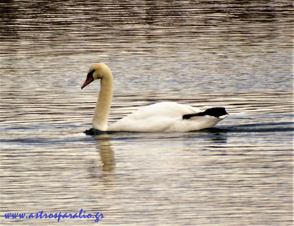 Κύκνος, του είδους Cygnus olor, ταξιδεύει στη λίμνη Μουστού με το ένα πόδι, έχοντας «κόψει» το άλλο στη πλάτη. Τούτο αποτελεί αγαπημένη συνήθεια για Κύκνο αυτού του είδους. (Φωτ. 17-1-2017, 13.20)