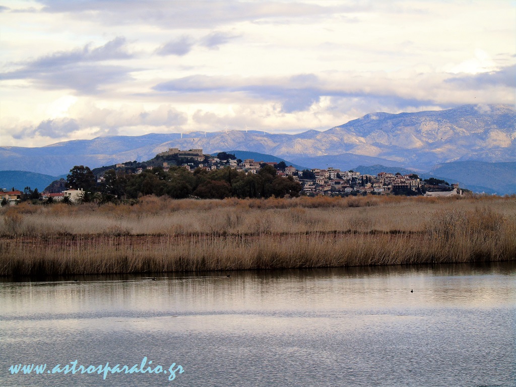 Το «Νησί» του Παραλίου Άστρους όπως φαίνεται από τη λίμνη «Μουστού» –http://wikimapia.org/#lang=el&lat=37.384992&lon=22.743925&z=17&m=b-. (Φωτ. 17-1-2017, 13.25)