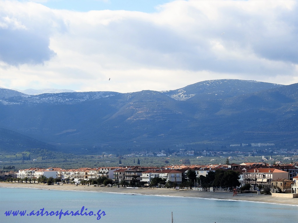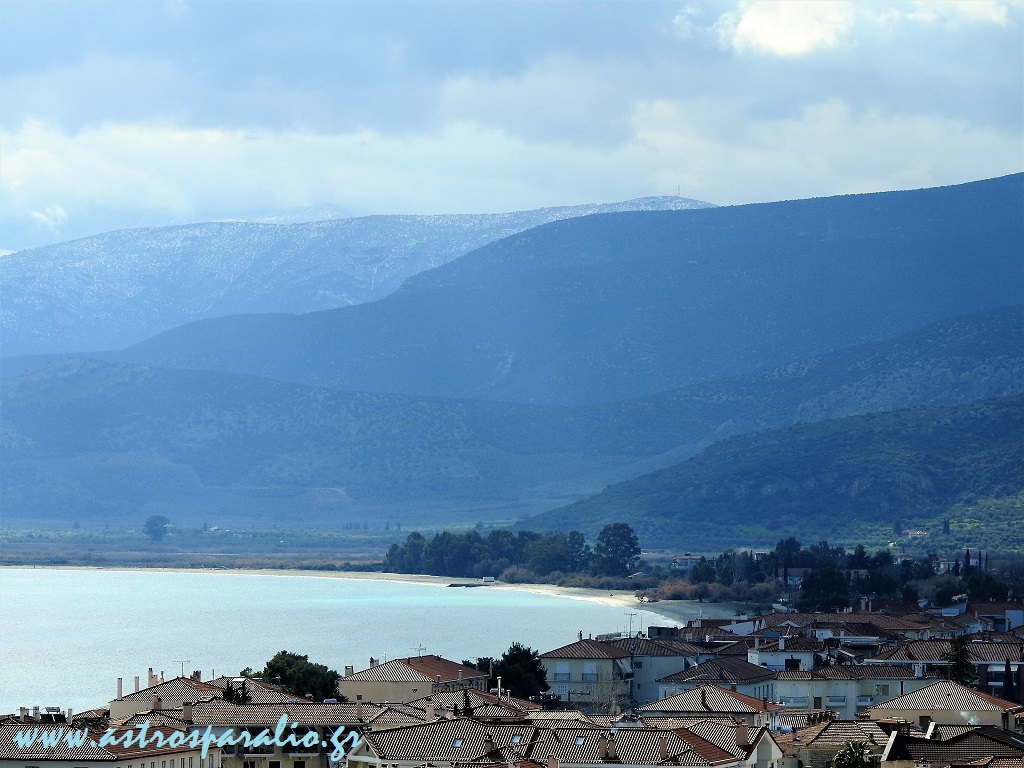 Χιόνι έριξε τη νύχτα στον Πάρνωνα, με αποτέλεσμα να έχουμε χαμηλές θερμοκρασίες στη περιοχή μας. Στο κάτω μέρος της φωτογραφίας η «Ακτή Καλλιστώ» στο Παράλιο Άστρος. (Φωτ. Παρασκευή 27-1-2017 12.40, θερμοκρασία 8 βαθμοί Κελσίου)