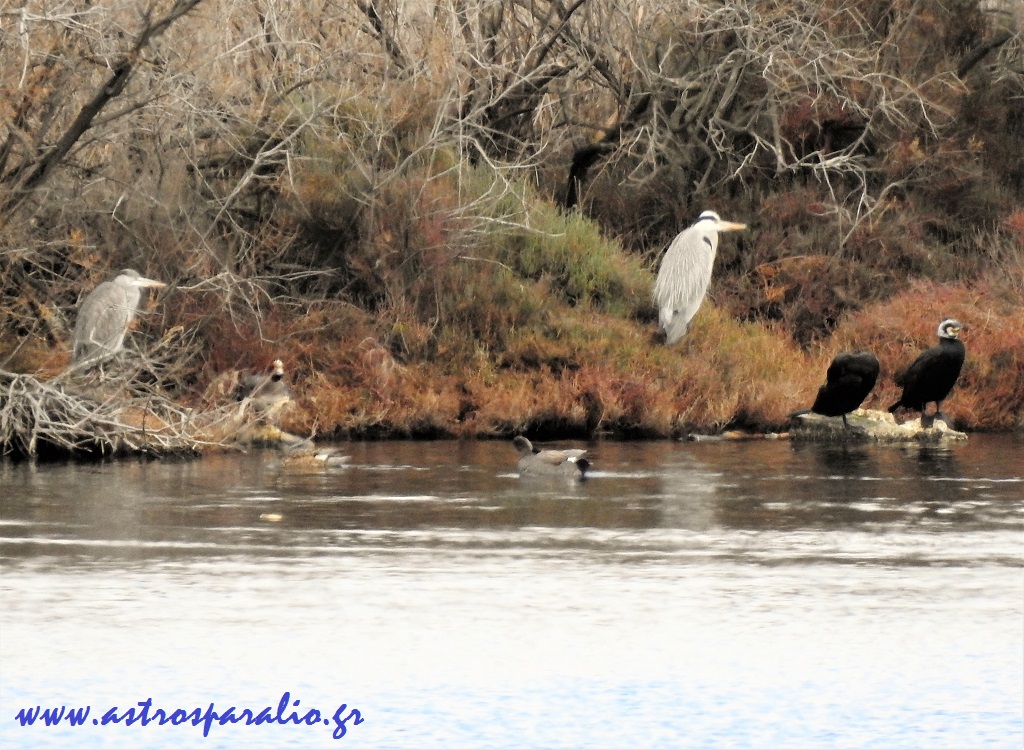 Σταχτοτσικνιάδες -με γκρι χρώμα-, Κορμοράνοι -με μαύρο χρώμα- και Αγριόπαπιες στη λίμνη Μουστού. (Φωτ. 27-1-2017, 13.20)
