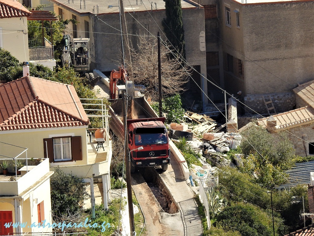 Η φωτογραφία, τραβηγμένη σήμερα 23-2-2017 στις 14.30, απεικονίζει τα μηχάνηματα που εργάζονται για την τοποθέτηση του αγωγού του δικτύου του βιολογικού, τα οποία βρίσκονται σε αυτό το σημείο –http://wikimapia.org/#lang=el&lat=37.415347&lon=22.768315&z=19&m=b– του περιφερειακού του Νησιού.