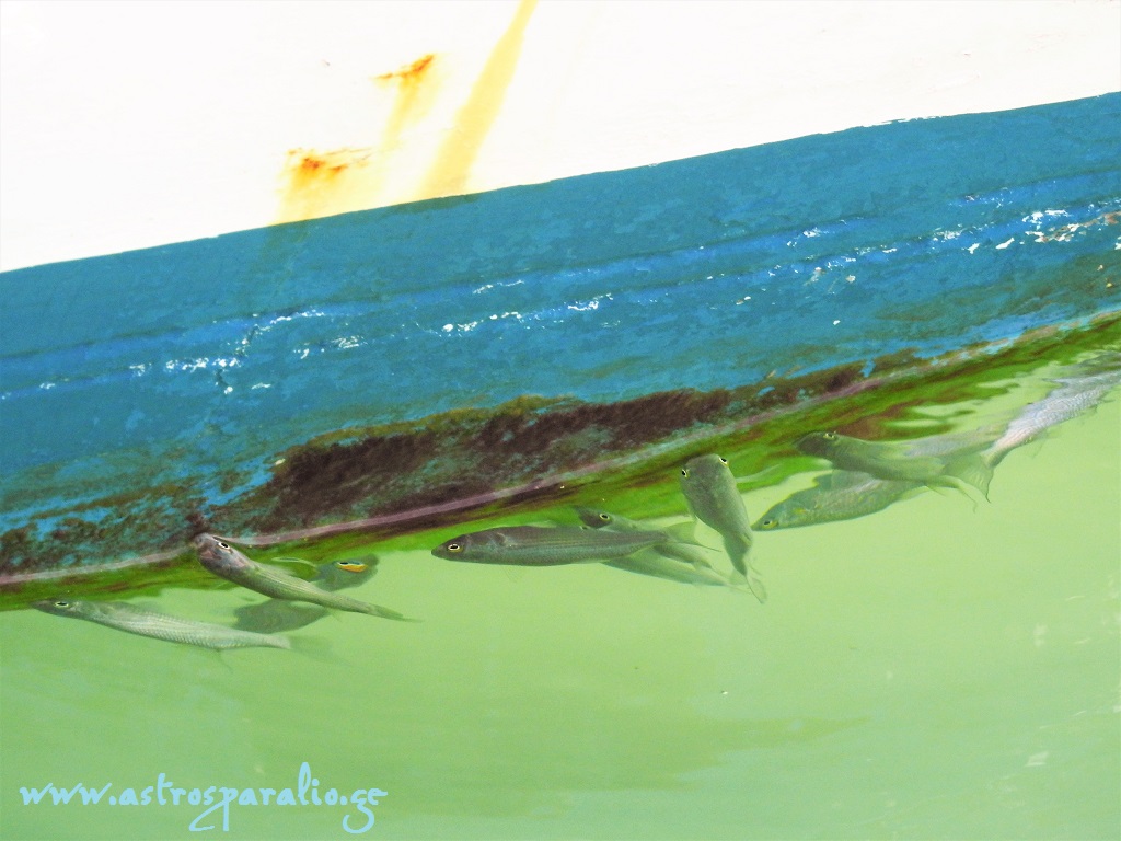 Κεφαλόπουλα «γευματίζουν» στα ύφαλα ψαροκάικου, στο λιμάνι Παραλίου Άστρους. (Φωτ. 12-9-2017, 14.40)