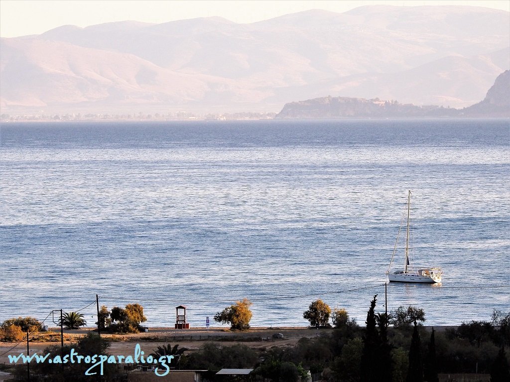 Παραλία Ατσίγγανος στο Παράλιο Άστρος, στο κέντρο του φόντου και δεξιά το Ναύπλιο. (Φωτ. 16-9-2017, 07.55)