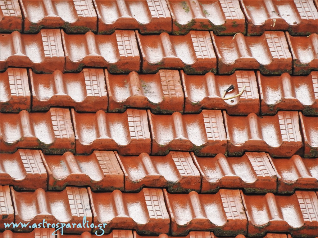 Βρέχει στο Παράλιο Άστρος. Φωτ. βρεγμένα κεραμίδια σπιτιού.