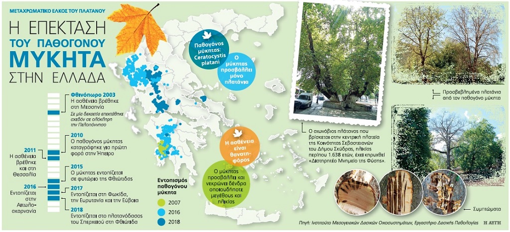 Όπως ενημέρωσε αναλυτικά τα μέλη της επιτροπής ο κ. Π. Τσόπελας, τακτικός ερευνητής, ειδικός στη Φυτοπαθολογία του Ινστιτούτου Μεσογειακών Δασικών Οικοσυστημάτων (ΙΜΔΟ), “αυτός ο μύκητας προσβάλλει μόνο πλατάνια. Αυτό είναι καλό, γιατί δεν κινδυνεύουν οι ελιές, οι καρυδιές και οι καστανιές από αυτό το παθογόνο. Ωστόσο, η ασθένεια είναι θανατηφόρος. Αυτό σημαίνει ότι αν ένα δέντρο προσβληθεί από την ασθένεια, δεν υπάρχει τρόπος ίασης. Το παθογόνο προσβάλλει και νεκρώνει δέντρα οιουδήποτε μεγέθους και ηλικίας. Έχουμε χάσει υπεραιωνόβια δέντρα πλατάνου. Κάποια από αυτά μπορεί να ήταν 500 ετών ή ακόμη και 1.000 ετών”.