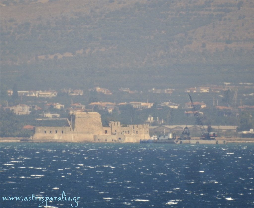 (Φωτ. βοριάς στο «Μπούρτζι», δίπλα το πλεούμενο είναι βυθοκόρος η οποία εκτελεί εκβάθυνση στο λιμάνι Ναυπλίου)