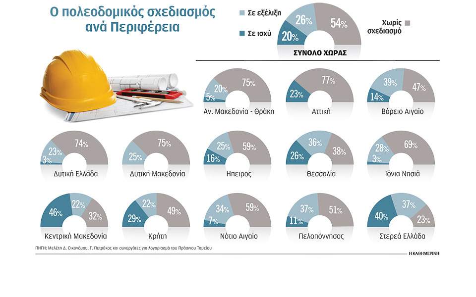 Κανένας πολεοδομικός σχεδιασμός δεν υπάρχει στο 54% της χώρας. Πολεοδομικό σχεδιασμό διαθέτει το 20%, ενώ στο 26% της επικράτειας οι μελέτες βρίσκονται σε εξέλιξη. Η πλέον πρόσφατη καταγραφή έγινε από ομάδα επιστημόνων υπό τον σημερινό υφυπουργό Δημήτρη Οικονόμου για λογαριασμό του Πράσινου Ταμείου, με σκοπό να υποστηριχθεί (στην αναζήτηση χρηματοδότησης) η ανάγκη να ξεκινήσει στη χώρα μας ένα εκτεταμένο πρόγραμμα χωροταξικού σχεδιασμού. Η βάση δεδομένων που δημιουργήθηκε θα χρησιμοποιηθεί και για την ιεράρχηση των περιοχών, ώστε να επιλεγούν εκείνες στις οποίες η πολιτεία πρέπει να επέμβει και να σχεδιάσει άμεσα τον χώρο.