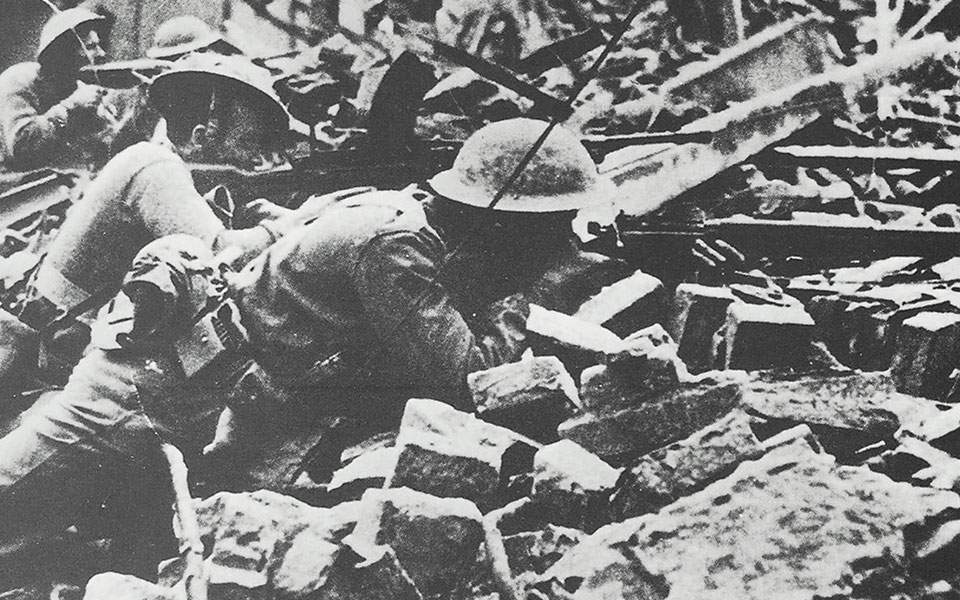 (Φωτ. Σεπτέμβριος 1944. Ανδρες της ΙΙΙ Ελληνικής Ορεινής Ταξιαρχίας μάχονται στους δρόμους του κατεστραμμένου Ρίμινι. Η πόλη παραδόθηκε άνευ όρων στις 21 του μηνός στο ΙΙ Τάγμα Πεζικού. Οι συνολικές απώλειες για τις ελληνικές δυνάμεις ανήλθαν σε 116 νεκρούς και 316 τραυματίες)