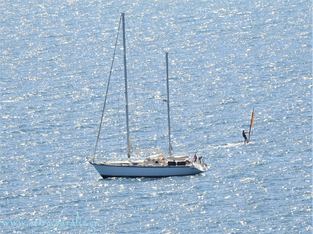 Σκάφος αναψυχής αγκυροβολημένο ανοιχτά στη κεντρική ακτή Παραλίου Άστρους και δίπλα του ιστιοσανίδα.