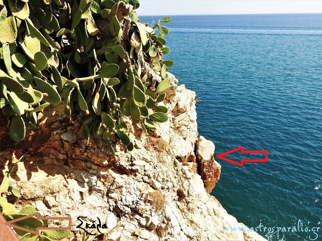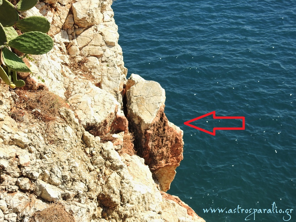 Βράχος (βλέπε φωτ. 13-10-2019) «κρέμεται από μια κλωστή» και είναι έτοιμος να αποκολληθεί, βρίσκεται δίπλα από τη σκάλα που συνδέει το Ανοιχτό Θέατρο Παραλίου Άστρους με το Φάρο. Το σημείο είναι «πολυσύχναστο», ψαράδες ψαρεύουν από την ακτή και από τη θάλασσα, λουόμενοι κολυμπούν, «τολμηροί» περιπατητές επισκέπτονται τη λεγομένη *Σπηλιά της Μπουμπουλίνας* κλπ.