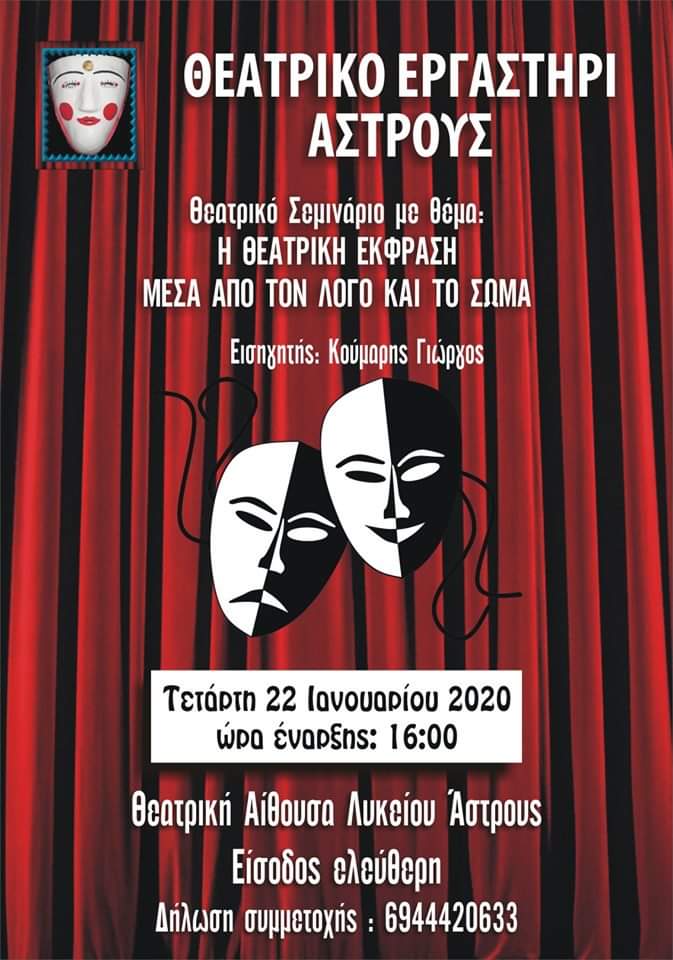 ΠΡΟΣΚΛΗΣΗ Το Θεατρικό Εργαστήρι Άστρους σας περιμένει όλους στο σεμινάριο που διοργανώνει με θέμα: «Η θεατρική έκφραση μέσα από τον λόγο και το σώμα», με εισηγητή τον Κούμαρη Γιώργο, την Τετάρτη 22 Ιανουαρίου και ώρα έναρξης 16:00, στην θεατρική αίθουσα του Λυκείου Άστρους. Είσοδος Ελεύθερη.