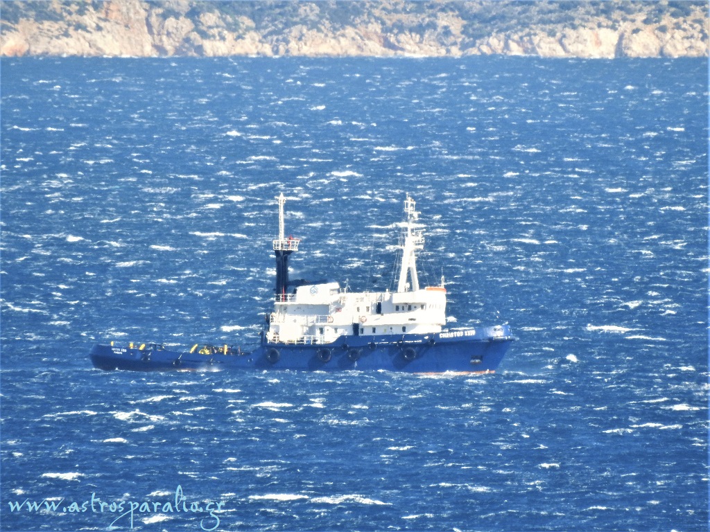 Αφρίζει όλος ο Αργολικός από το Δυτικό άνεμο, ο οποίος έφτανε και τα 7 μποφόρ. Φωτ. tugboat ανοιχτά από το Νησί Παραλίου Άστρους. (Τετάρτη 5-2-2020 12.50, θερμοκρασία 14 βαθμοί Κελσίου)