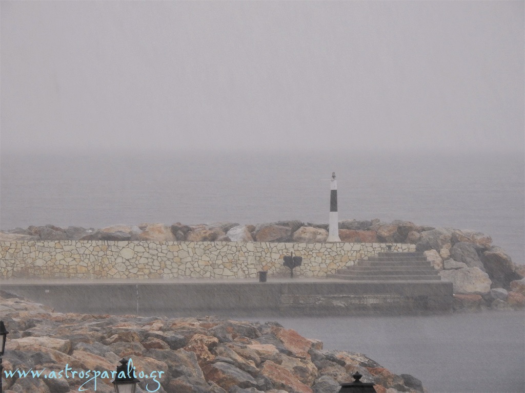 Βρέχει στη Παραλία Αγίου Ανδρέα Κυνουρίας, δεξιά στο φόντο. Φωτ. από το Νησί Παραλίου Άστρους. (22-2-2020, 13.50)