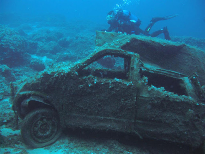 Δεκάδες κουφάρια αυτοκινήτων έχουν γίνει ένα με το βυθό, δημιουργώντας μια παράταιρη εικόνα. Σκόρπια ανταλλακτικά και λάστιχα έχουν γίνει τμήμα της υποβρύχιας φύσης. Το απόκοσμο, σχεδόν μακάβριο, σκηνικό αποτελεί attraction για φτασμένους και επίδοξους βατραχανθρώπους. Γιατί μακάβριο; Διότι το φαινόμενο δεν έχει εξηγηθεί ακόμα επαρκώς. Τη λύση στο πέπλο μυστηρίου που το καλύπτει γνωρίζουν μόνο τα… πλάσματα του βυθού, που βρίσκουν καταφύγιο στις «άψυχες» λαμαρίνες.