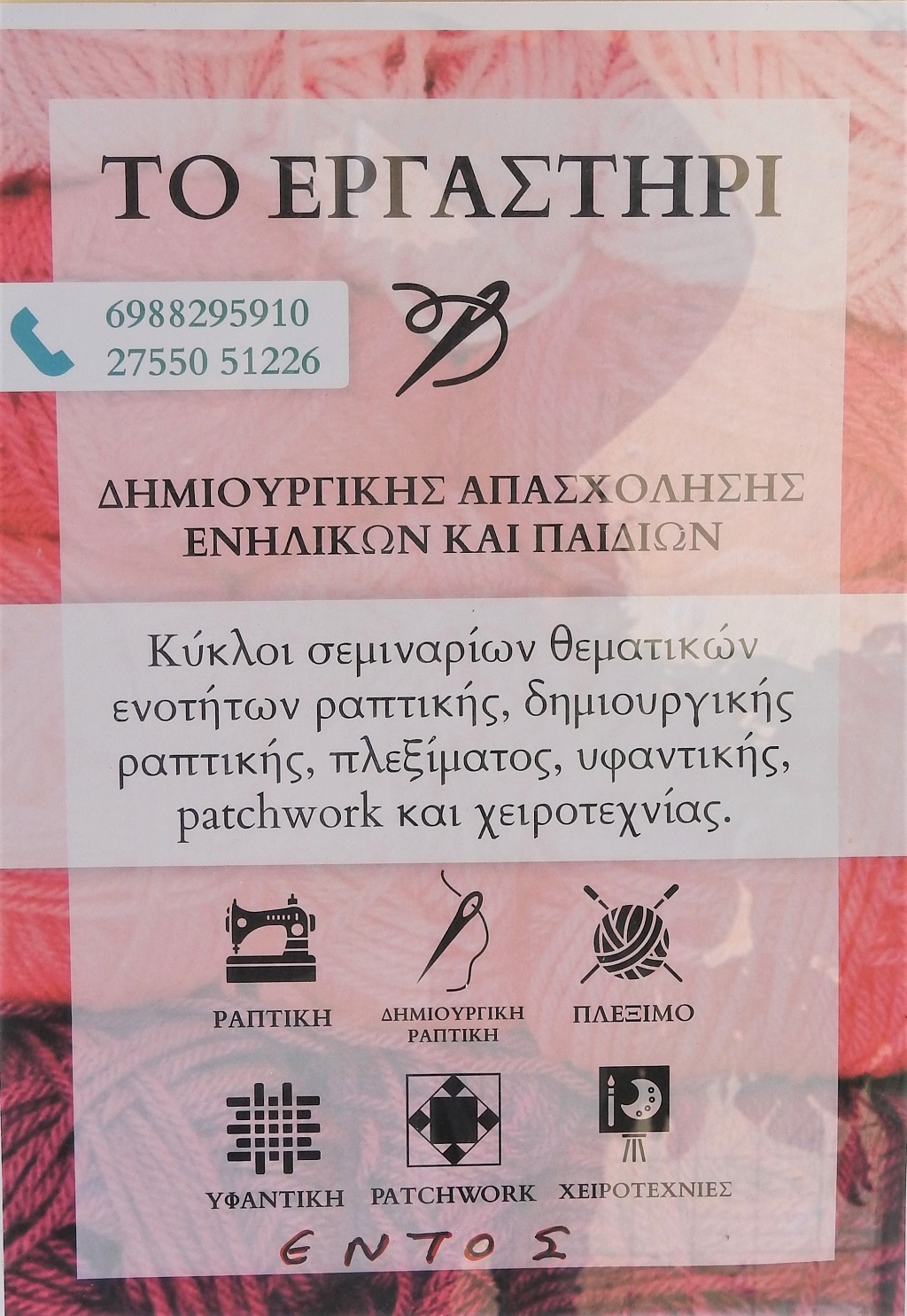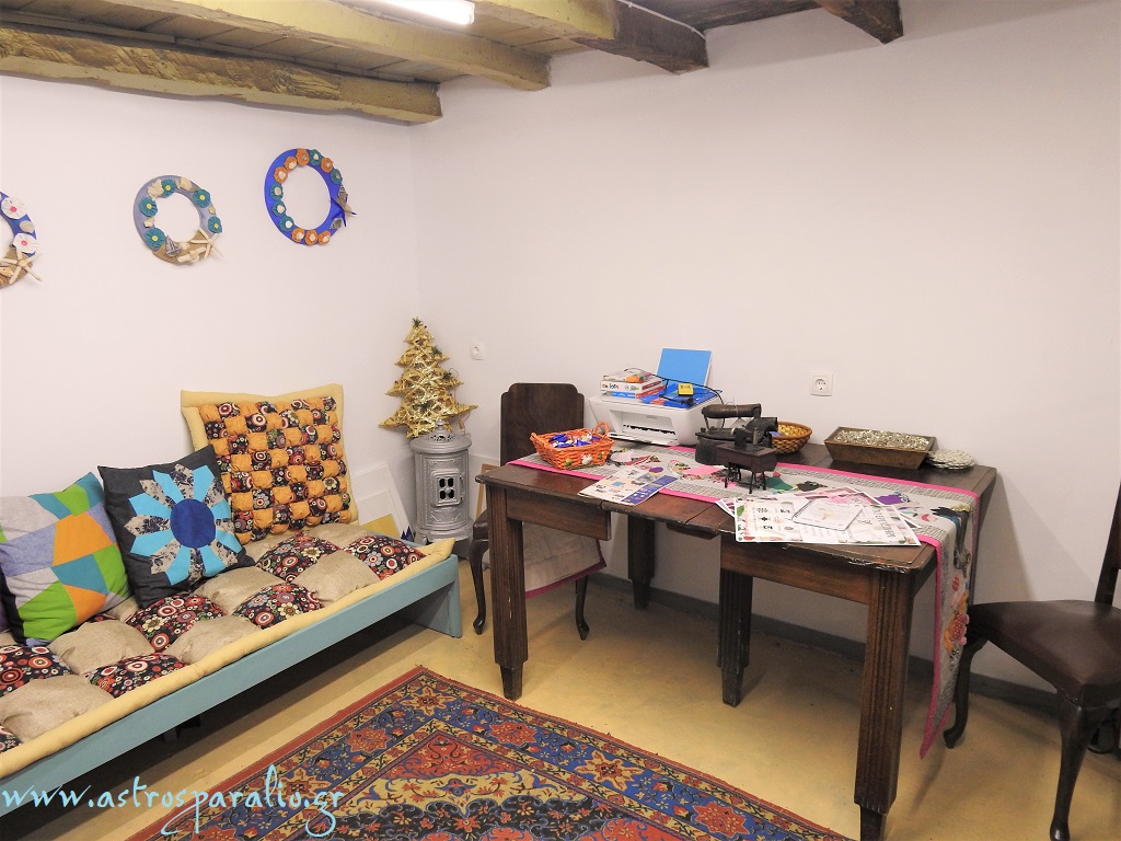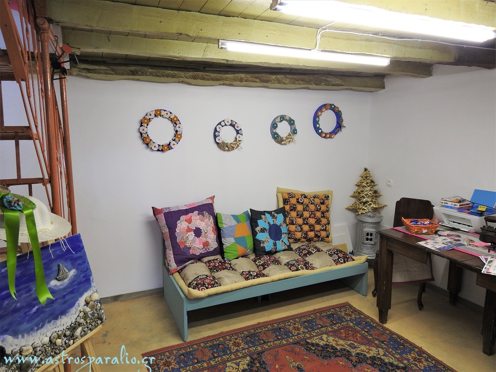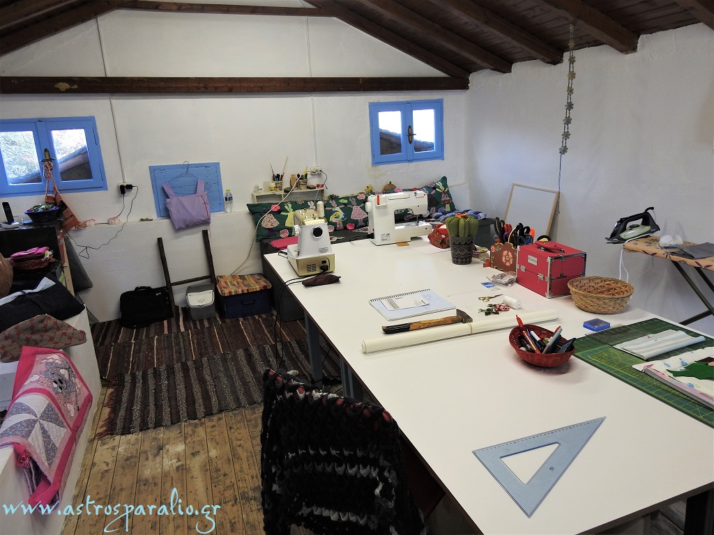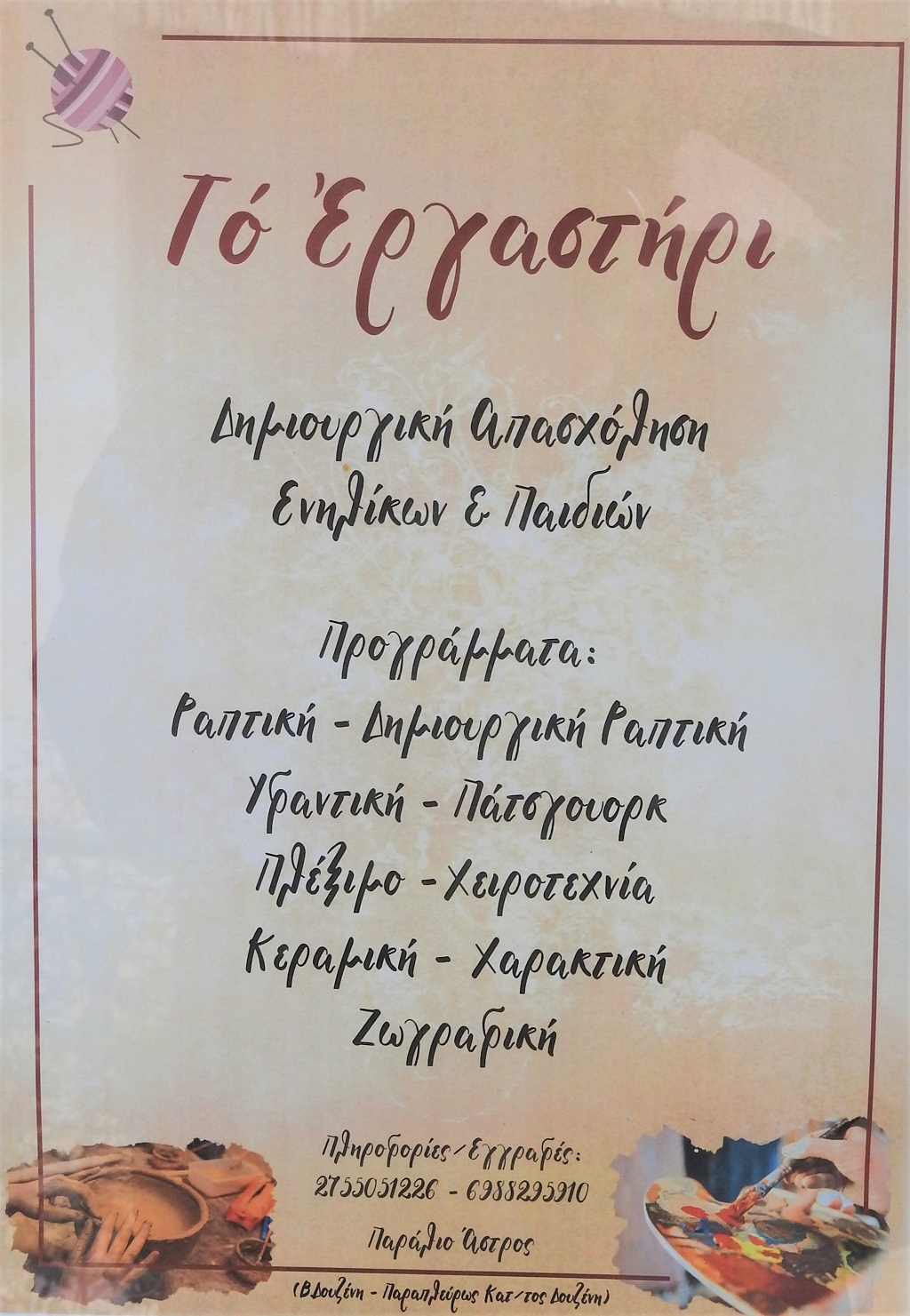 Η ανάγκη επικοινωνίας και εκτόνωσης μας οδήγησε στην ανάγκη δημιουργίας ενός χώρου τέχνης και χαράς. Έτσι λοιπόν, στο Παράλιο Άστρος , στη παλιά ταβέρνα της Αφροδίτης Κουτσογιάννη, είσοδος από την οδό Βασιλείου Δουζένη, λειτουργεί το ΕΡΓΑΣΤΗΡΙ ΔΗΜΙΟΥΡΓΙΚΗΣ ΑΠΑΣΧΟΛΗΣΗΣ ΕΝΗΛΙΚΩΝ ΚΑΙ ΠΑΙΔΙΩΝ, με σεμινάρια ραπτικής, patchwork, υφαντικής, πλεξίματος, δημιουργικής χειροτεχνίας, ζωγραφικής , κεραμικής κ.α.