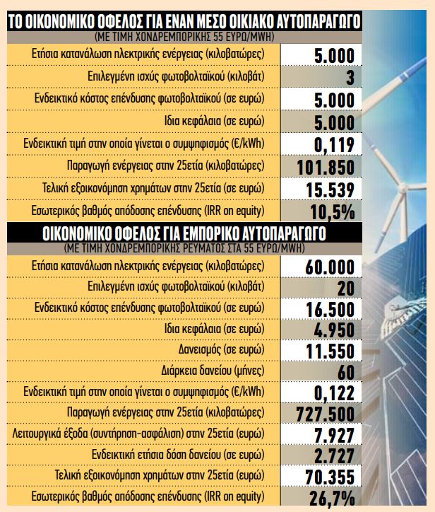 Για τον εμπορικό καταναλωτή (φούρνος, καφέ, εστιατόριο κ.λπ.) που καταναλώνει 60.000 κιλοβατώρες, το επενδυτικό κόστος 16.500 ευρώ (4.950 ίδια κεφάλαια και τα υπόλοιπα με δάνειο πενταετίας) θα αποσβεστεί νωρίτερα, στα έξι χρόνια (διότι συμψηφίζεται ο ΦΠΑ) και το όφελος στην 25ετία θα είναι 70.355 ευρώ, αφαιρώντας έξοδα συντήρησης-ασφάλισης, με τον βαθμό απόδοσης της επένδυσης να υπολογίζεται στα 26,7%.