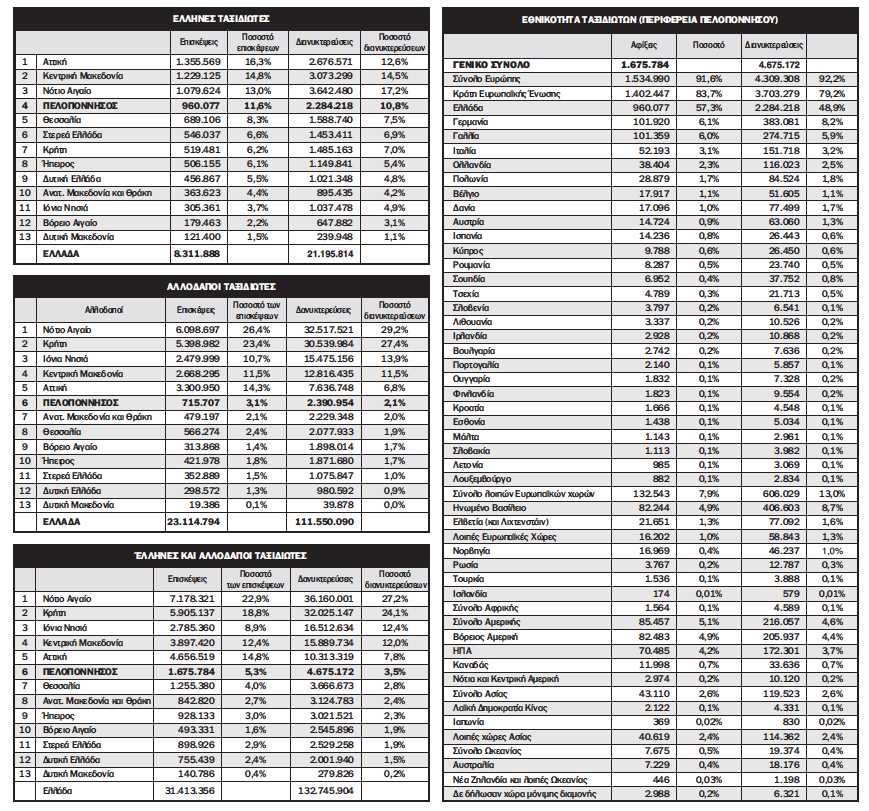 Σύμφωνα λοιπόν με τα στοιχεία της Ελληνικής Στατιστικής Αρχής η Περιφέρεια Πελοποννήσου αποσπά το 11,6% της πίτας των 8.311.888 αφίξεων Ελλήνων ταξιδιωτών και μόλις το 3,1% της πίτας των 23.114.749 αφίξεων αλλοδαπών τουριστών. Σύμφωνα με την ίδια πηγή η Περιφέρεια Πελοποννήσου αποσπά το 10,8% της πίτας των 21.195.814 διανυκτερεύσεων Ελλήνων ταξιδιωτών και μόλις το 2,1% της πίτας των 111.550.090 διανυκτερεύσεων αλλοδαπών τουριστών. Συνολικά η Πελοπόννησος αποσπά το 5,3% των 31.413.356 αφίξεων σε ξενοδοχεία, καταλύματα και κάμπινγκ καθώς 3,5% των 132.745.904 διανυκτερεύσεις.