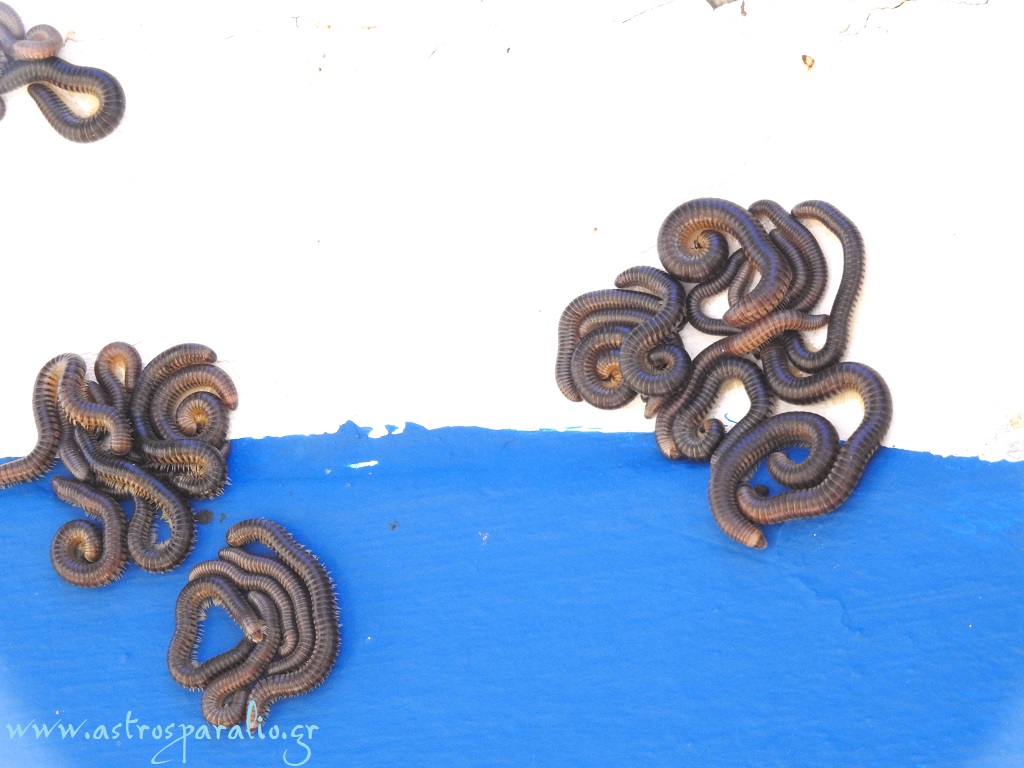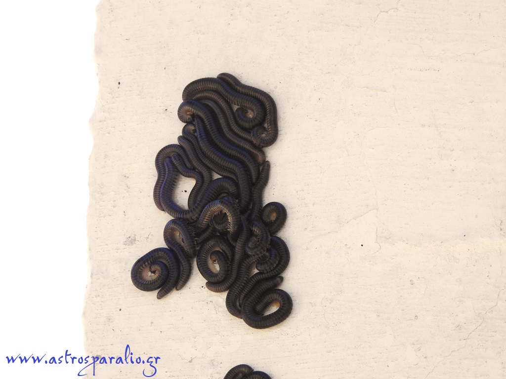 Φθινόπωρο και υγρασία τα Μαύρα Σκουλήκια Ommatoiulus moreleti «οργίασαν» και κάλυψαν σχεδόν το καμπαναριό της Ευαγγελίστριας στο Νησί Παραλίου Άστρους. (Φωτ. 23-10-2023)