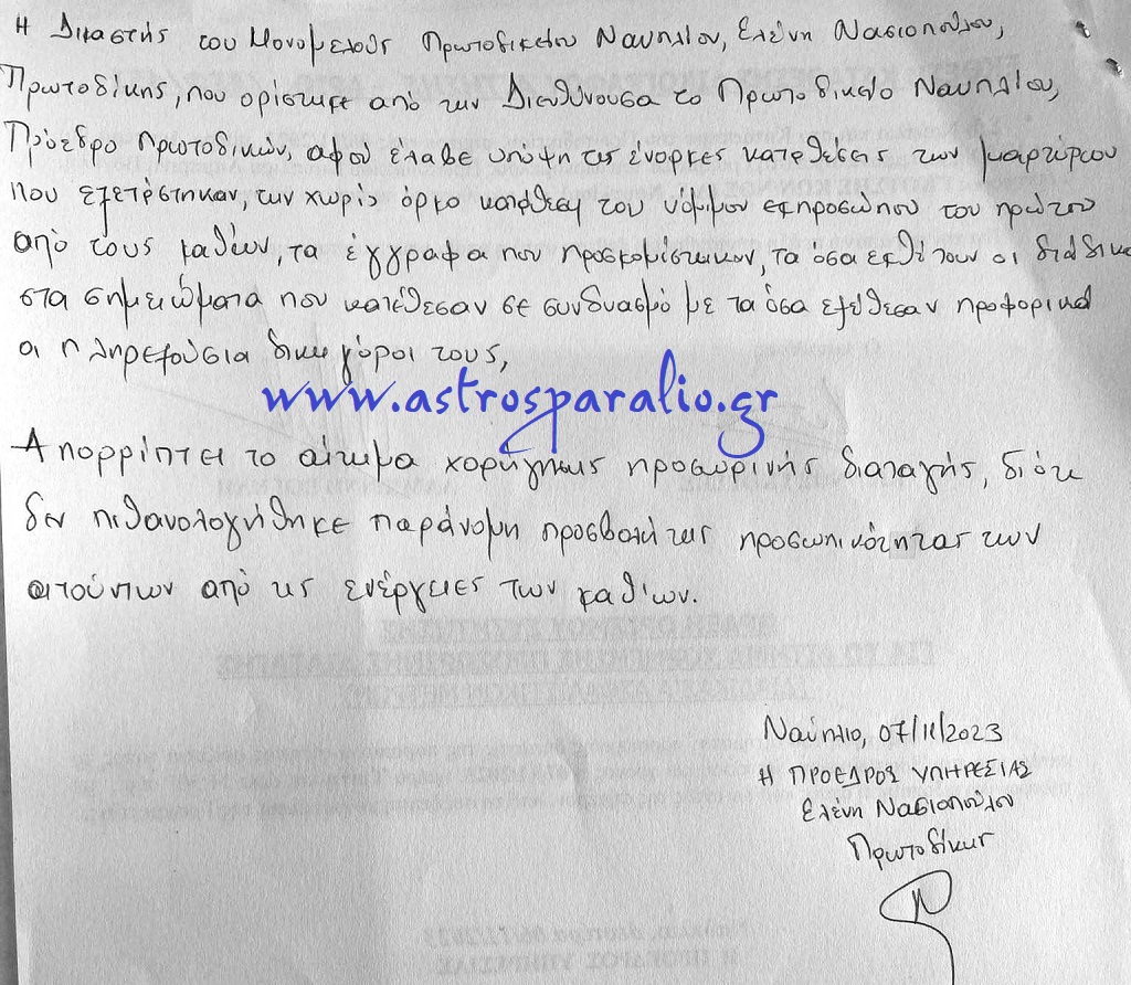 Χτες 7-11-2023 συζητήθηκε στο Πρωτοδικείο του Ναυπλίου το αίτημα κατοίκων του Παραλίου Άστρους για έκδοση προσωρινής διαταγής για να σταματήσει το έργο του «Χάντακα» στο Παράλιο Άστρος. Σύμφωνα με το σκεπτικό του δικαστηρίου απορρίφθηκε το αίτημα χορήγησης προσωρινής διαταγής για το σταμάτημα των εργασιών του σχετικού έργου, βλέπε σχετικό έγγραφο.