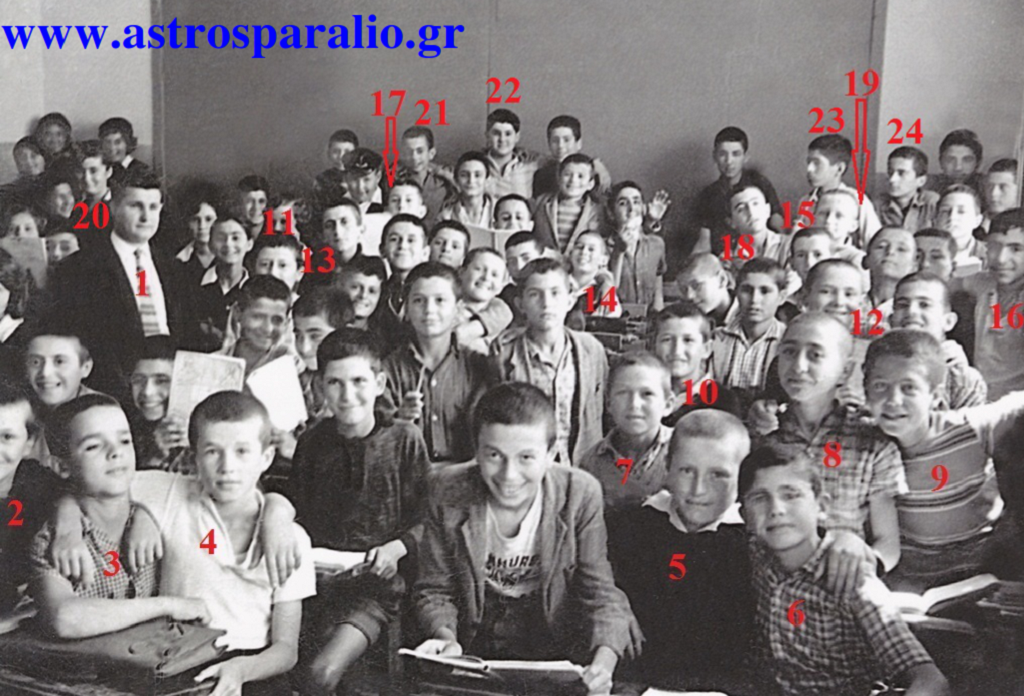 Η φωτογραφία απεικονίζει τoν καθηγητή και την μαθητιώσα νεολαία της Πρώτης τάξης του Γυμνασίου Άστρους, η αναγνωρισθείσα ομήγυρη αποτελείται, σύμφωνα με την αρίθμηση, από τα εξής μέλη: 1. Δημήτριος Κουρελής (καθηγητής), 2. Μανώλης Σούρσος (Πλάτανος), 3. Γιώργος Παπαγιαννόπουλος (Άστρος), 4. Νίκος Αλουπογιάννης (Άστρος), 5. Κώστας Καραμπάτσος (Παράλιο Άστρος), 6. Γιάννης Μπούζιος (Βέρβενα), 7. Βαγγέλης Κουτρουμπής (Ξηροπήγαδο), 8. Μιχάλης Κουτίβας (Άστρος), 9. Χρήστος Ρούνης (Στόλος), 10. Παναγιώτης Καραματζιάνης (Βέρβενα), 11. Γιώργος Πολυμενόπουλος (Άστρος), 12. Τάκης Κασκαμπάς (Δολιανά), 13. Γιάννης Λαμπρινός (Μελιγού), 14. Σούλης Χασαπογιάννης (Άστρος), 15. Κώστας Βέμμος (Προσήλια), 16. Σούλης Ταμπάκης (Πλάτανος), 17. Αλέξανδρος Κρασόπουλος (Παράλιο Άστρος), 18. Γιώργος Καραματζιάνης (Άστρος), 19. Γρηγόρης Τσιρόπουλος (Κορακοβούνι), 20. Δήμητρα Κασκαμπά (Βέρβενα), 21. Βαγγέλης Κούκλης (Παράλιο Άστρος), 22. Κώστας Φαρμασώνης (Καστρί), 23. Νίκος Γεωργάς (Μελιγού) και 24. Βασίλης Μπούζιος (Άστρος).