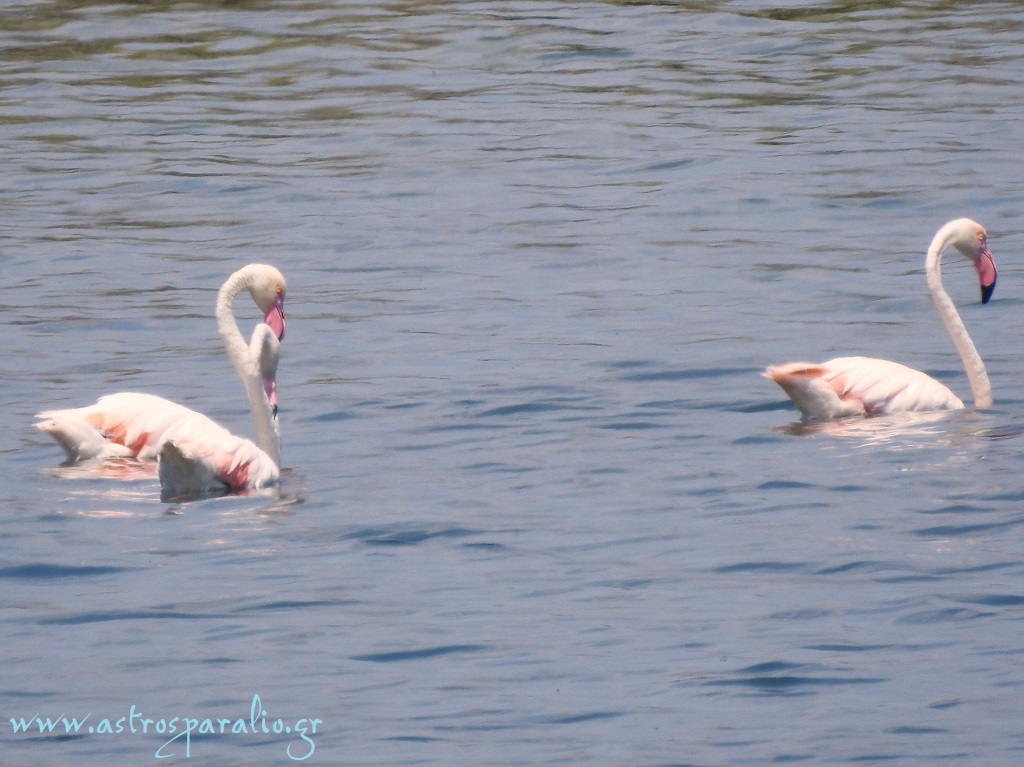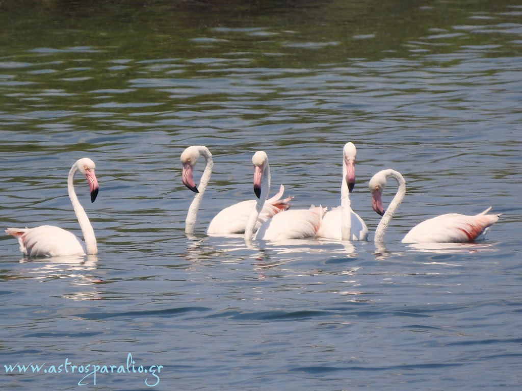 8 Φλαμίνγκο του είδους Phoenicopterus roseus «προσθαλασσώθηκαν» σήμερα (12-7-2024) στη λίμνη Μουστού.