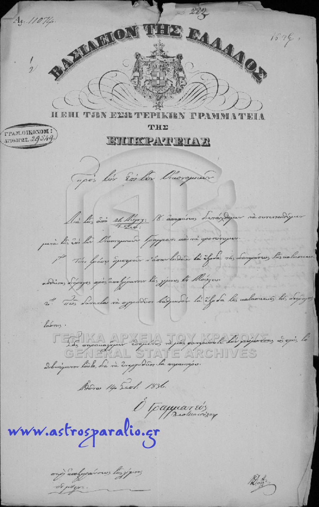 Νο 2. 1836, έγγραφο των Γενικών Αρχείων του Κράτους σχετικά με την αποξήρανση της λίμνης Μουστού