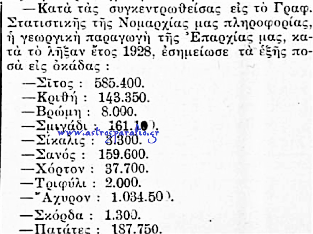 Η εφημερίδα «Κυνουρία», σε φύλλο του 1929, μας πληροφορεί για τη γεωργική παραγωγή του 1928 της επαρχίας Κυνουρίας, σημερινοί Δήμοι Βόρειας και Νότιας Κυνουρίας.