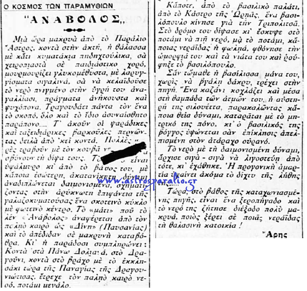 Νο 2. 1930, δημοσίευμα της εφημερίδας «Κυνουρία» για τον Ανάβαλο στα Λιλαίικα
