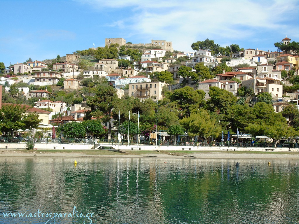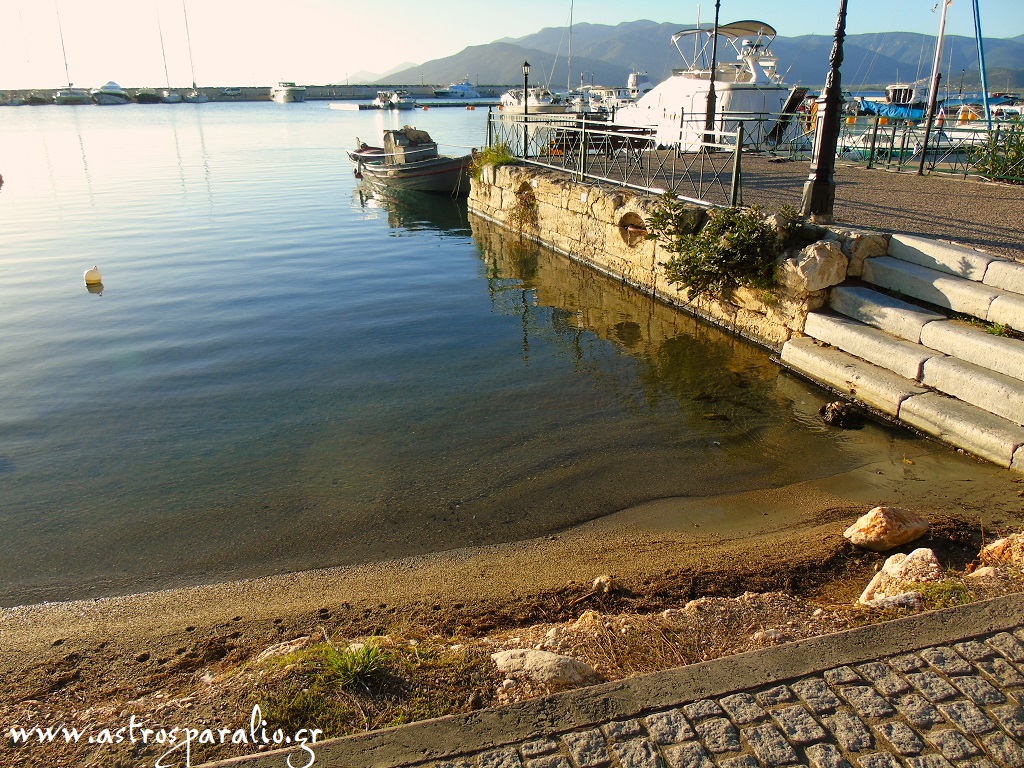Κεντρική πλατεία και Νησί Παραλίου Άστρους, από τη λιμενολεκάνη. (Τρίτη 21-10-2025 11.45, θερμοκρασία 23 βαθμοί Κελσίου)