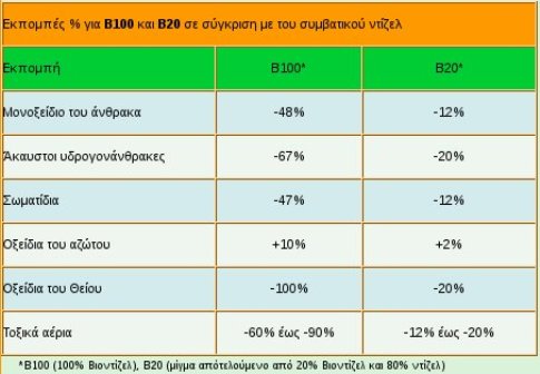 Ο παρακάτω πίνακας συνοψίζει το τυπικό προφίλ εκπομπών από την καύση του καθαρού βιοντίζελ (Β100), αλλά και ενός από τα πλέον συνηθισμένα μίγματά του με συμβατικό ντίζελ το οποίο αποτελείται από 20% βιοντίζελ και 80% ντίζελ (Β20), χρησιμοποιώντας ως αναφορά τις εκπομπές από την καύση του πετρελαϊκού ντίζελ.
